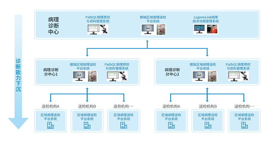 区域病理中心的区域病理送检平台系统提供覆盖区域多个送检机构并连接区域病理中心的信息服务。通过基于区域病理送检平台系统实现建立区域病理诊断中心的互助式协同服务模式、建立面向市县乡一体化的独立病理诊断资源集成服务模式,以及服务于社区医疗卫生机构的快速反应服务模式,打造病理诊断能力逐级下沉的信息化支持体系。一方面优化医疗资源配置,减少重复投资造成的浪费,另一方面通过共享病理诊断资源,解决社区医院医疗资源不足等问题。