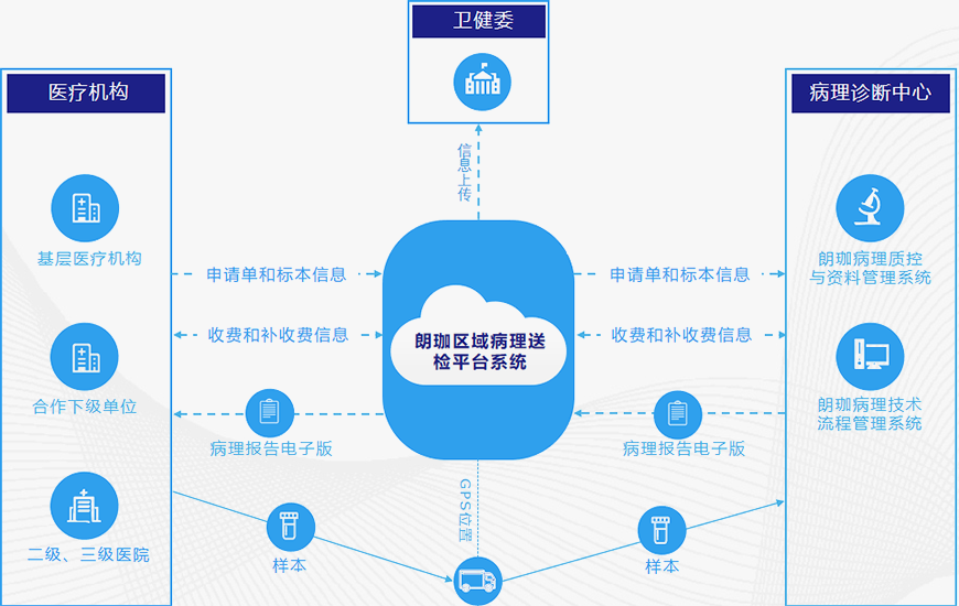 朗珈区域病理送检平台系统,适用于医联体医共体模式、公立医院或第三方独立实验室为区域病理诊断中心、以样本送检模式,打造将病理诊断中心与区域内各样本送检单位(无病理科)紧密结合的区域病理信息平台。