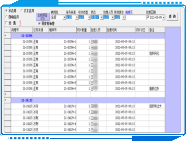 自动生成切片条码标签列表,并批量打印切片条码标签,支持切片合并流程。