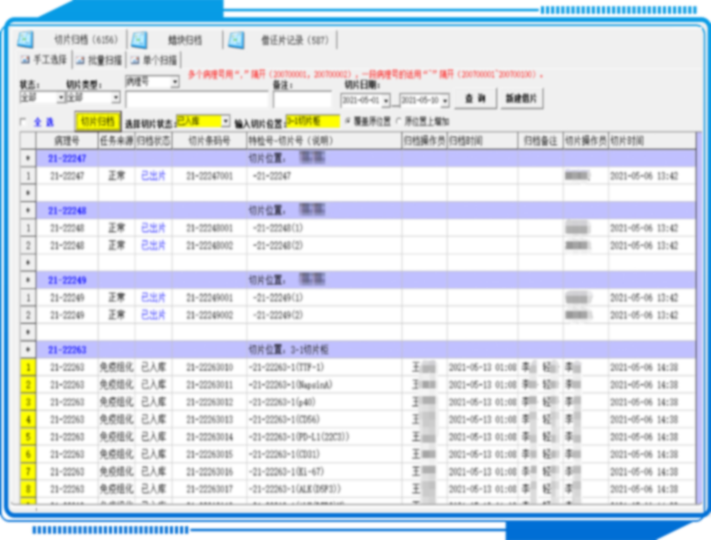 按照病理号区段,将资料、蜡块、玻片分别归档处理,录入具体的归档位置。