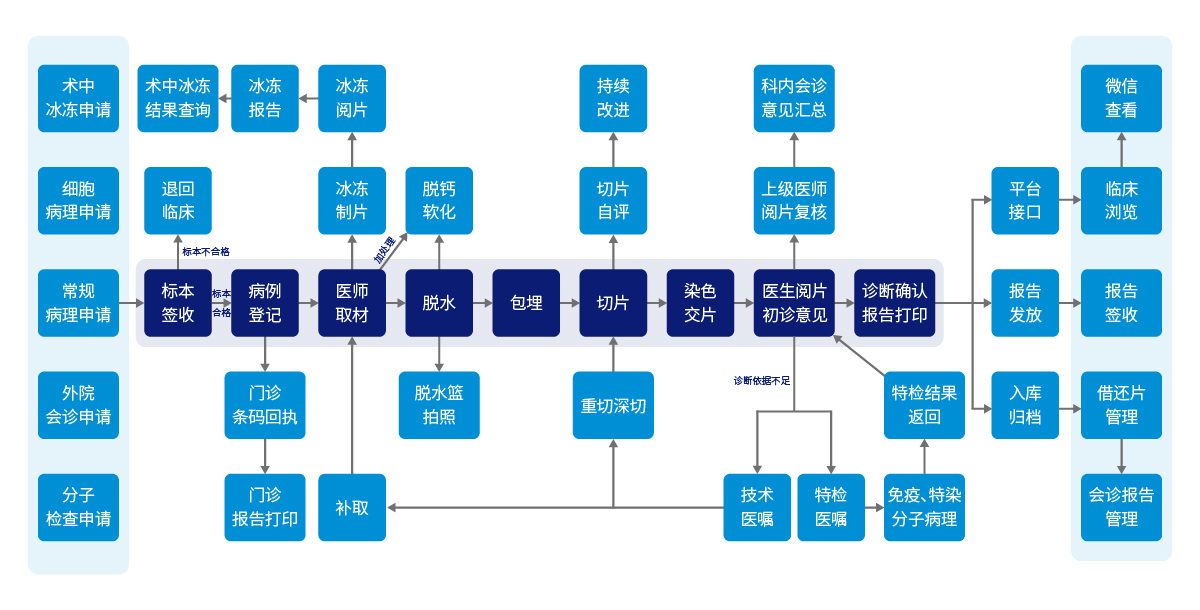 PathQC系统将病理科完整的工作流程(如图)进行综合管理,为流程中的各个环节度身定制了不同的站点软件,分工合作、统一管理, 共同构成一个完整的病理科室管理网络。